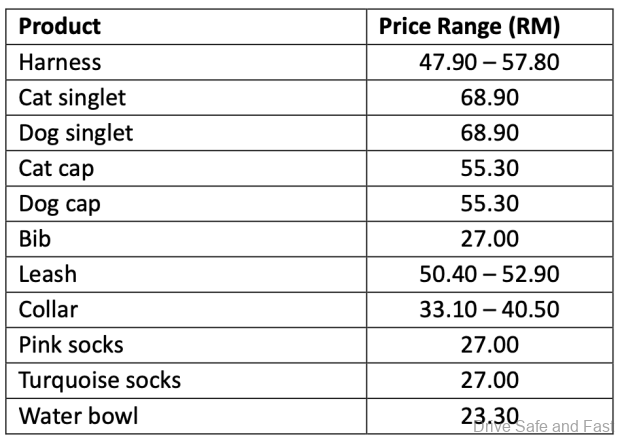 Prices for the collection start from as low as RM23.30 for a water bowl, while apparel such as cat and dog singlets retail at RM68.90 each. Harnesses are priced between RM47.90 and RM57.80, while accessories like collars (RM33.10 – RM40.50) and leashes (RM50.40 – RM52.90) round off the range.
