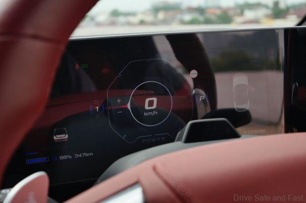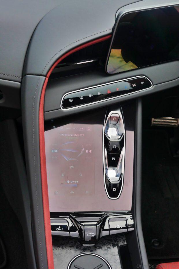 Conceptually, I quite like that they’ve given you a triple screen cockpit with an additional fourth screen, but the execution is not perfect. The first issue I have is that none of the displays are particularly bright and they’re all very reflective. It’s usable in darker environments and when the top is down, but in Malaysian sunlight with the roof down you really need to squint to understand what’s being shown. They also don’t appear to be laminated, so there’s a bit of an airgap between the interface and the surface that your finger touches. It makes an otherwise futuristic concept look very dated. The final issue is that the fourth display by the gear selector buttons was easily scratched. We’re not sure if the scratches were on a screen protector or on the actual surface itself but it looked really bad especially considering we were the first to take the car and it looked like that right away.