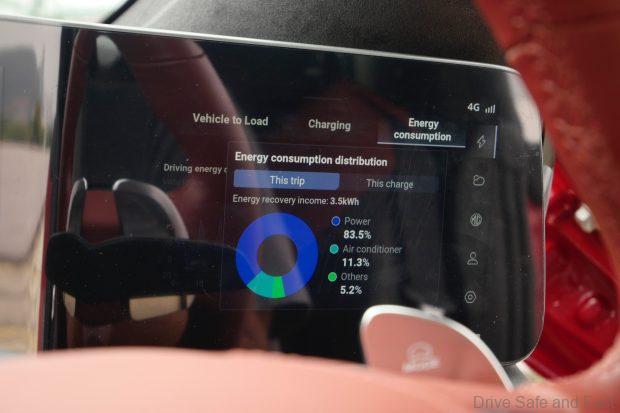 The centre screen displays speed, and some condensed trip computer info alongside the time and relative power output. Think of this as your typical driver’s info display for real time drive related information.