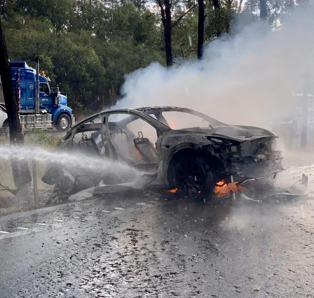 Emergency services shut down the Pacific Highway near Rainbow Flat in Australia at about 2.30pm on Friday afternoon after a Tesla Model Y crashed south of Taree and was on fire.
