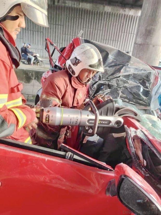 Firefighters next act to remove the victim using special equipment (due to the severity of the accident the Iriz had crumpled) before handing the victim over to the Royal Malaysian Police (PDRM) for further action.