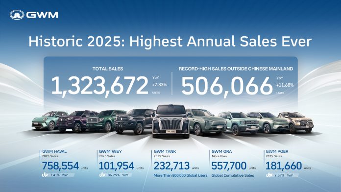 Great Wall Motor (GWM) has concluded 2025 with its strongest performance in history, setting new benchmarks for total volume and international growth. According to the company’s latest annual report, GWM sold a total of 1,323,672 vehicles in 2025, marking a 7.33% year-on-year increase and cementing its status as a global automotive powerhouse.