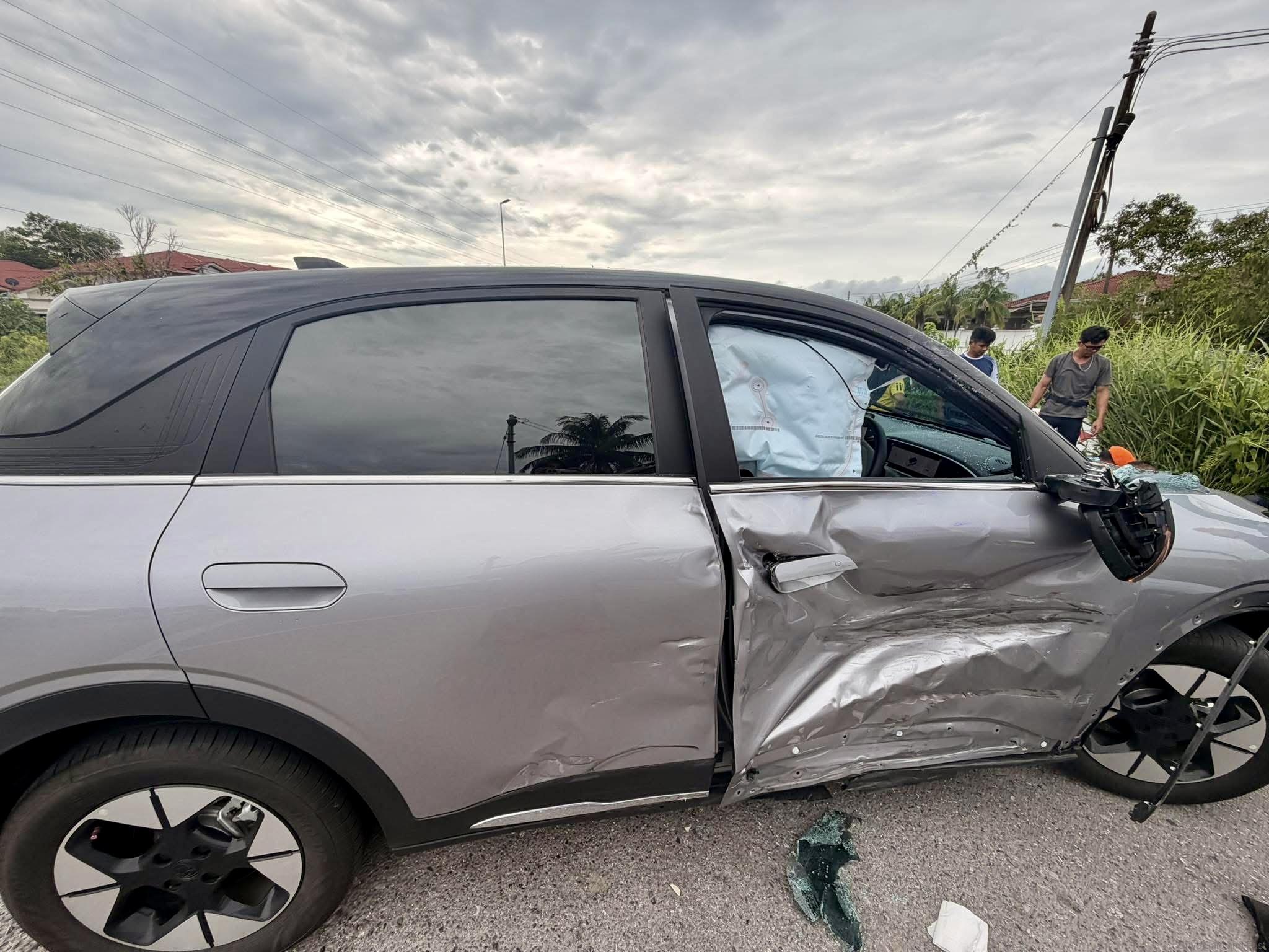 New car owners hate it when their shiny new car gets into accident ….. even worse when it is NOT their fault. Well, sadly this Proton eMAS 5 electric compact car owner just weeks from collecting his car was hit by another vehicle while waiting at a junction.