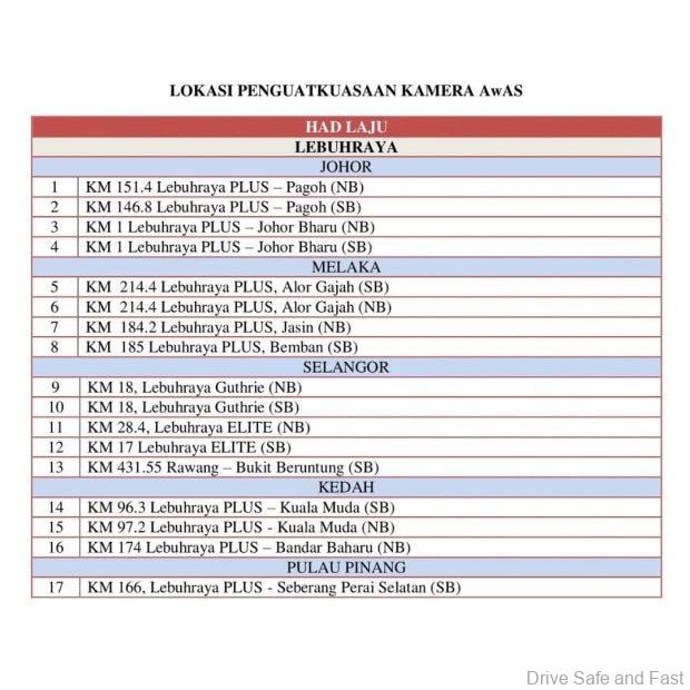 | Speed Cameras | PLUS Highway (Pagoh, Alor Gajah, Slim River), LEKAS, ELITE, and SKVE |