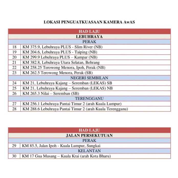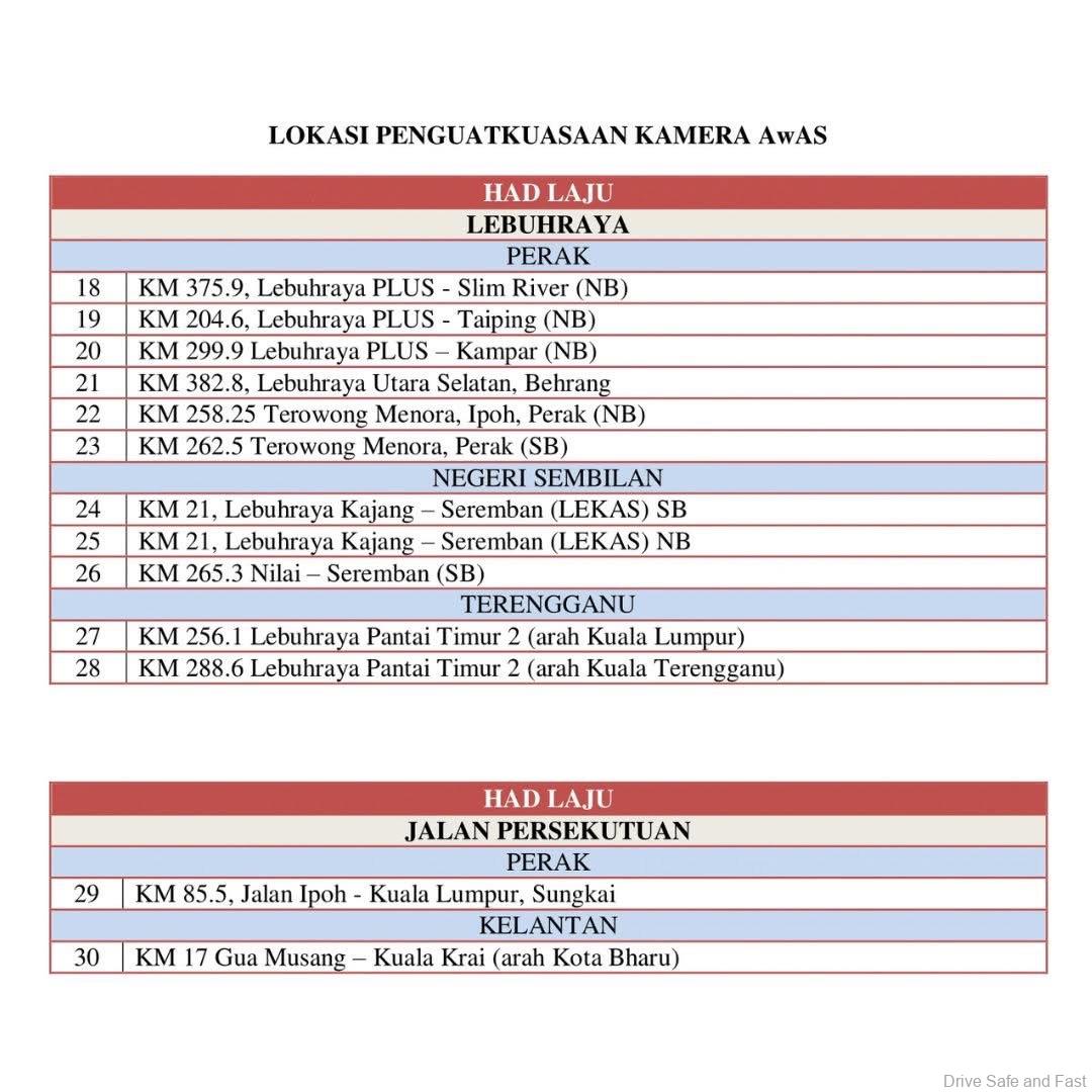 | Speed Cameras | PLUS Highway (Pagoh, Alor Gajah, Slim River), LEKAS, ELITE, and SKVE |