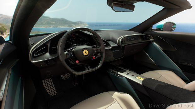Ferrari has prioritized passenger comfort through innovative aero-solutions. A highlight is the integrated wind deflector built into the rear bench backrest. Activated at the touch of a button, it creates a “bubble of comfort” by significantly reducing turbulence and noise in the cabin during high-speed open-air driving.