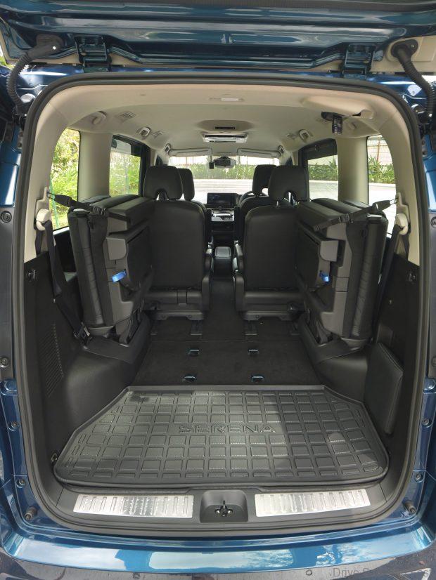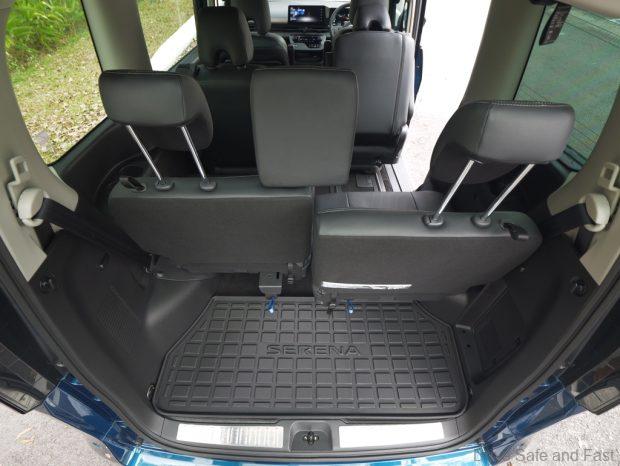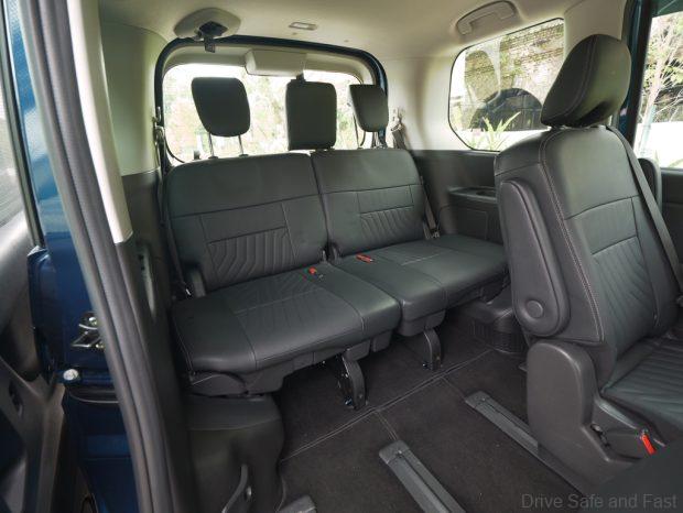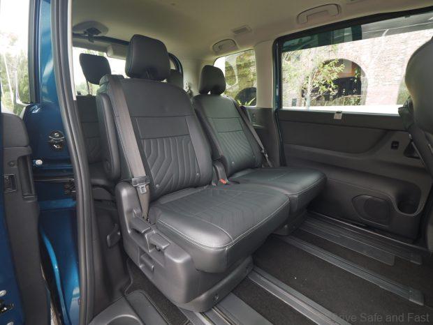 The middle row seats are not quite captain seats though they have narrow individual arm rests. These only have a single fixed stop. Not the most comfortable place to be, indicating the Serena is focused on family and not boss-chauffering. You can separate the two middle seats or squeeze them together depending on what they’re being used for.
