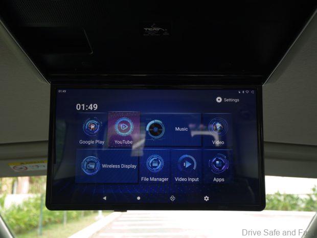 Each passenger in the rear is taken care of with ceiling-mounted air cond vents, grab handles, a flip down monitor running Android, cupholders and USB-C ports.