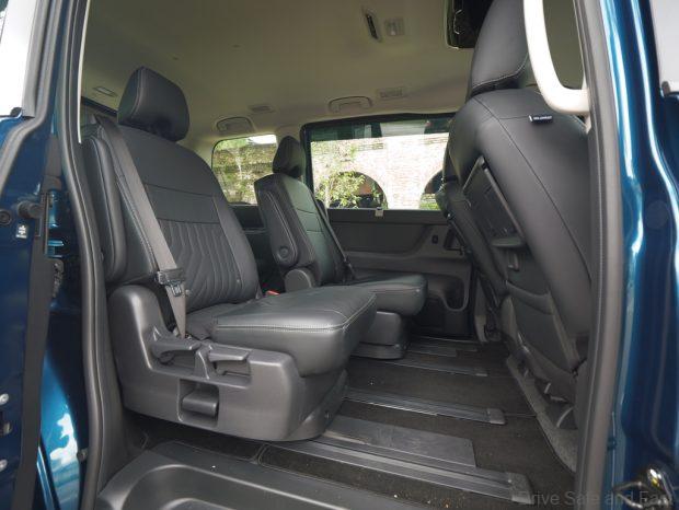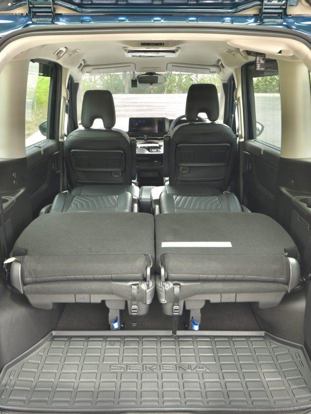 The middle row seats are not quite captain seats though they have narrow individual arm rests. These only have a single fixed stop. Not the most comfortable place to be, indicating the Serena is focused on family and not boss-chauffering. You can separate the two middle seats or squeeze them together depending on what they’re being used for.