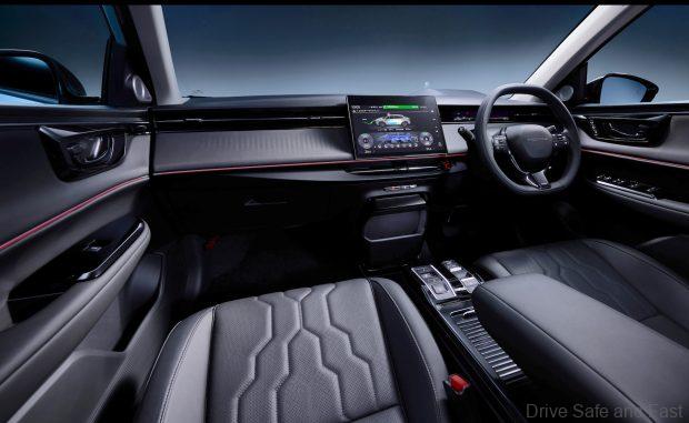 The interior design features a form that creates a feeling of enclosure and occupant comfort, with a rounded design that emphasises continuity throughout the cabin space. The use of high-quality, soft-padded materials and the placement of LED ambient lighting along the contours of the instrument panel and doors contributes to the creation of a high-quality and seamlessly integrated interior space comfortable for all occupants.