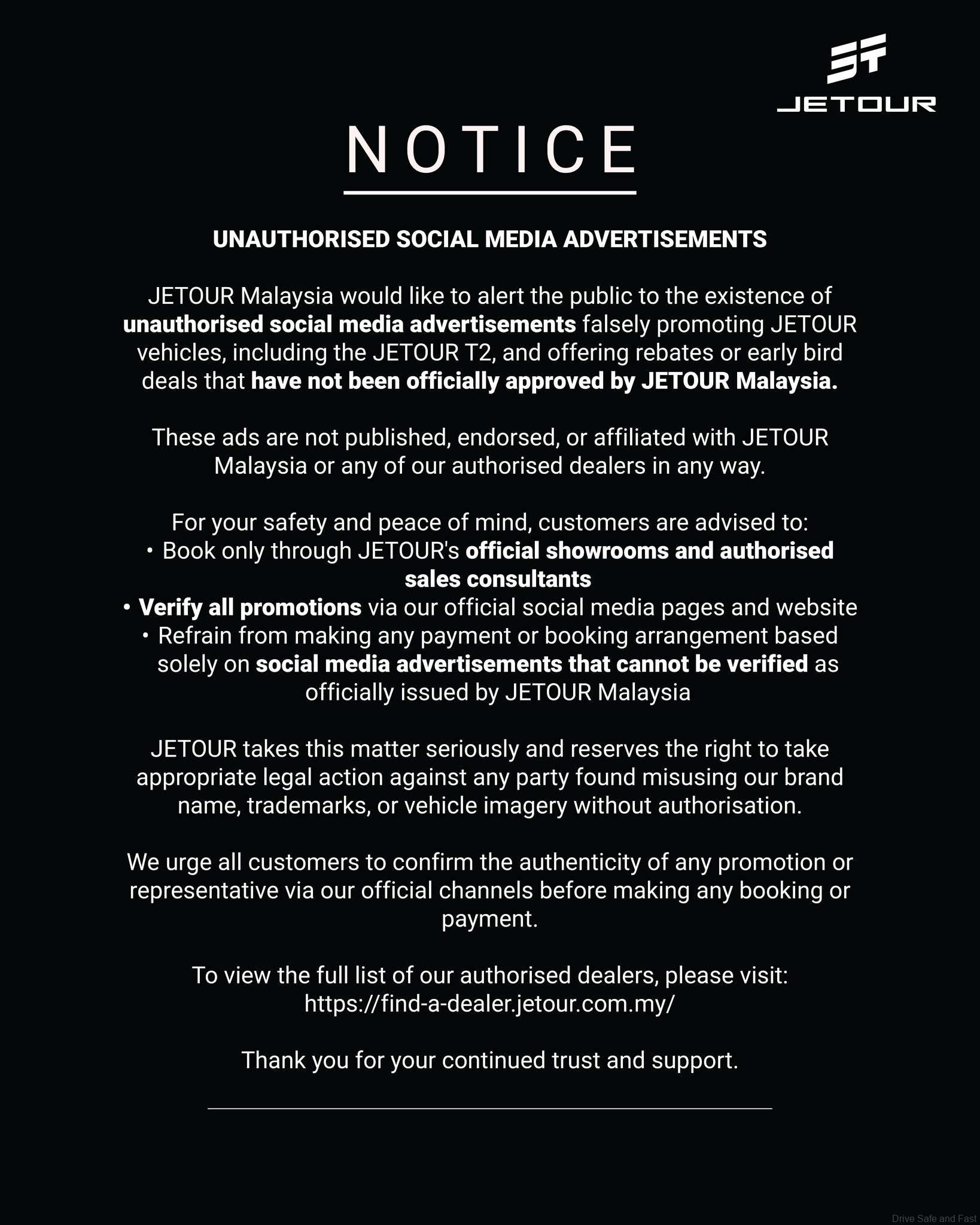 JETOUR Malaysia would like to alert the public to the existence of unauthorised social media advertisements falsely promoting JETOUR vehicles, including the JETOUR T2, and offering rebates or early bird deals that have not been officially approved by JETOUR Malaysia.