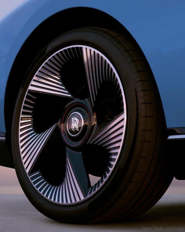 Against this serenity, 24-inch wheels – the largest fitted to a Rolls-Royce – strike a considered contrast. Their directional design is inspired by the propellers of a yacht viewed from beneath the waterline: forms that appear to be in continuous motion even when the motor car is stationary. The surface also includes subtle, machined stripes, creating the impression of wire wheel spokes moving at speed, while aluminium flakes within the black finish introduce a delicate sparkle as the wheel turns.