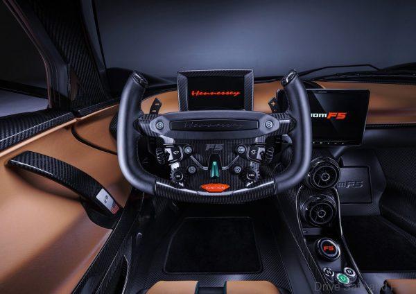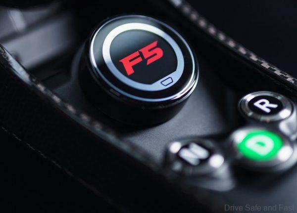 As the driver opens the F5’s butterfly door, they are greeted with a bespoke carbon fibre steering wheel, which is inspired by an aeroplane ‘yoke’ and an F1 racing car’s steering wheel. To maximise driver visibility of instrumentation and the road ahead, the top of the wheel is eliminated, while also encouraging proper hand placement for optimal steering wheel control. The parts of the steering wheel where the hands naturally grip, are leather-clad, the rest is exposed carbon-fibre. On the wheel are tactile controls for lights, windscreen wipers and turn signals, while in the centre sits a green switchable mode dial that lets the driver select from Sport, Wet, Drag, Track, and F5 modes.