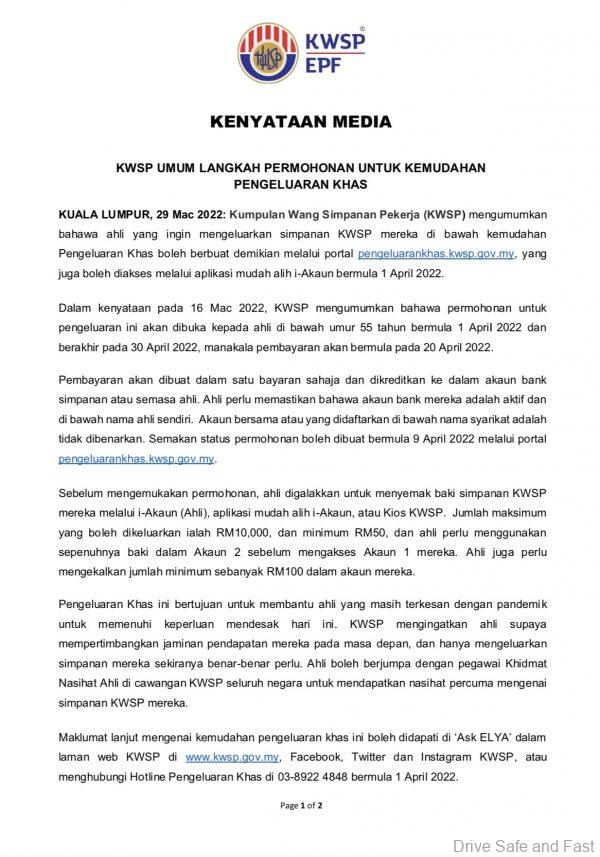 There will be many Malaysians rushing to withdraw RM10,000 from their Kumpulan Wang Simpanan Pekerja (KWSP) from today as the government has given the approval under ‘Kemudahan Pengeluaran Khas’ which can be done via the KWSP website at this address www.pengeluarankhas.kwsp.gov.my which will be active via the i-Akaun starting today the 1st of April 2022.