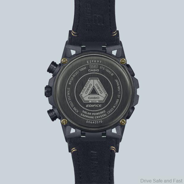 • Reflecting the EDIFICE brand’s focus on “Speed and Intelligence,” the EFS-S640ZE incorporates carbon-fiber materials and Italian-made Alcantara on the band loop. The gold-colored metal loop engraved with “50th ANNIVERSARY” is a standout detail on this sleek, black timepiece, representing Casio’s commitment to style and performance.