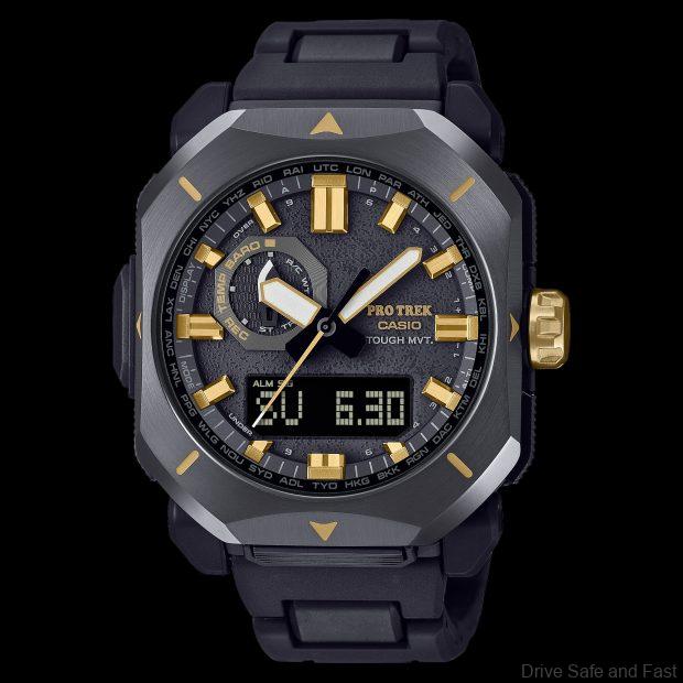 • Designed for outdoor enthusiasts, the PRO TREK PRW-6900ZE features an octagonal face and a Field Composite Band that combines resin and metal for enhanced durability. Bio-based resin, an environmentally friendly material, is used in key resin components, aligning with Casio’s commitment to sustainability. The watch includes a gold IP link engraved with “50th ANNIVERSARY” on the band.