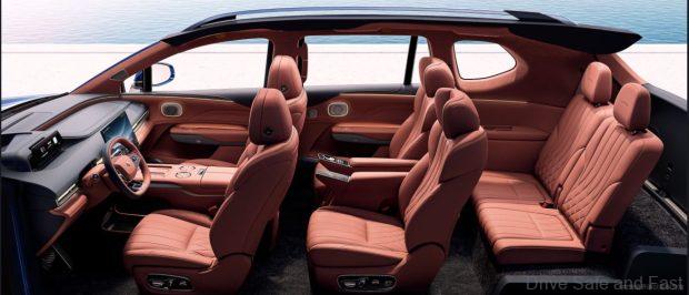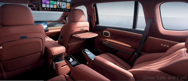 The Hyptec HL embraces what GAC describes as a “land yacht design concept.” Its distinctive exterior features crystal lamp bead headlights and an innovative center grille with individual light units capable of creating various lighting patterns. Customers can select from four elegant color options: Nautical Blue, Ice Rock Gray, Deep Sea Green, and Night Shadow Black.