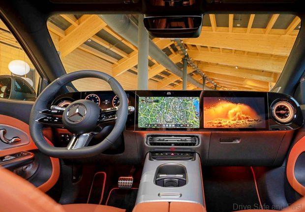 The interior features a high-tech, radically redesigned aesthetic. The optional MBUX Superscreen includes a 26 cm (10.25 inch) driver display, a 35.6 cm (14 inch) central display, and an optional 35.6 cm (14 inch) front passenger display. This system operates on the proprietary Mercedes-Benz Operating System (MB.OS). Driver assistance features, standard in Europe, include the MB.DRIVE system with DISTRONIC distance control, utilising eight cameras, five radar sensors, and 12 ultrasonic sensors for enhanced safety. Passive safety is bolstered by a new centre airbag, standard and deployed between the driver and front passenger during severe side impacts, alongside an improved body shell for added side impact protection.